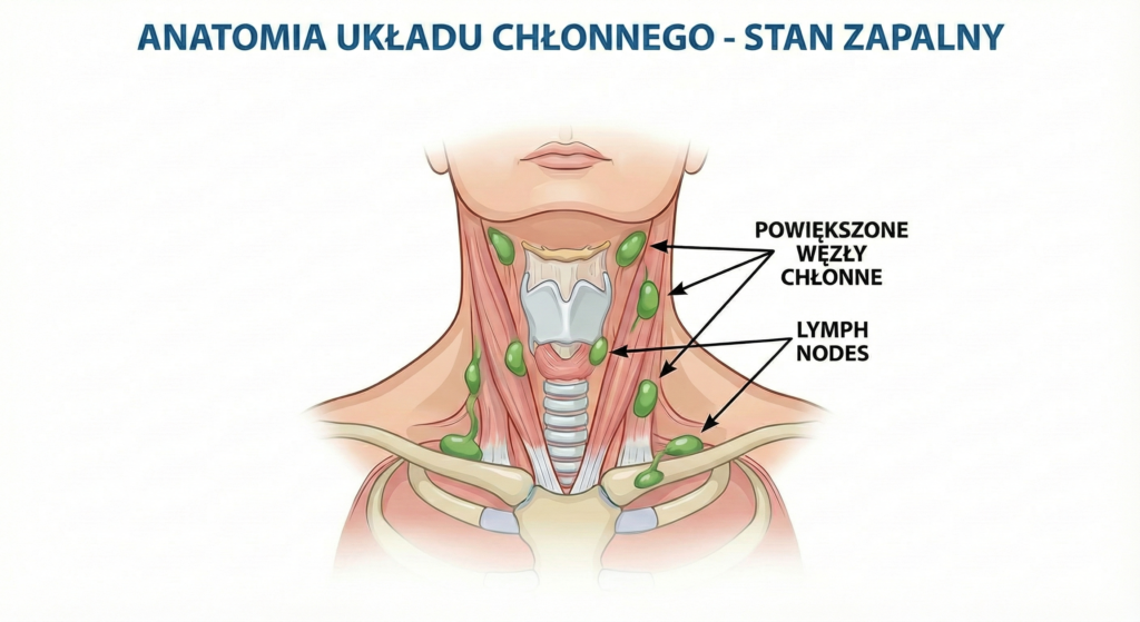 Powiększone węzły chłonne na szyi budzą szczególne zainteresowanie, ponieważ są stosunkowo łatwe do zlokalizowania podczas badania palpacyjnego. Najczęściej mają postać miękkich, bolesnych guzków, które pojawiają się w przebiegu infekcji górnych dróg oddechowych, zapalenia gardła lub migdałków. W większości przypadków zmiany te ustępują samoistnie po wyleczeniu infekcji. Jeżeli jednak węzły utrzymują się dłużej lub zmieniają swoją konsystencję, konieczna jest dalsza diagnostyka.